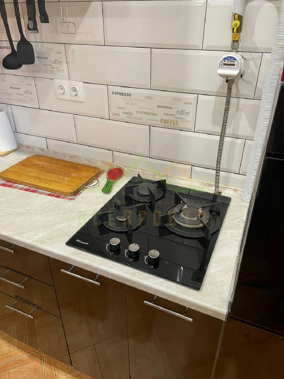 Кухня со встроенной техникой: газовая плита с духовым шкафом, вытяжка, посудомоечная машина.